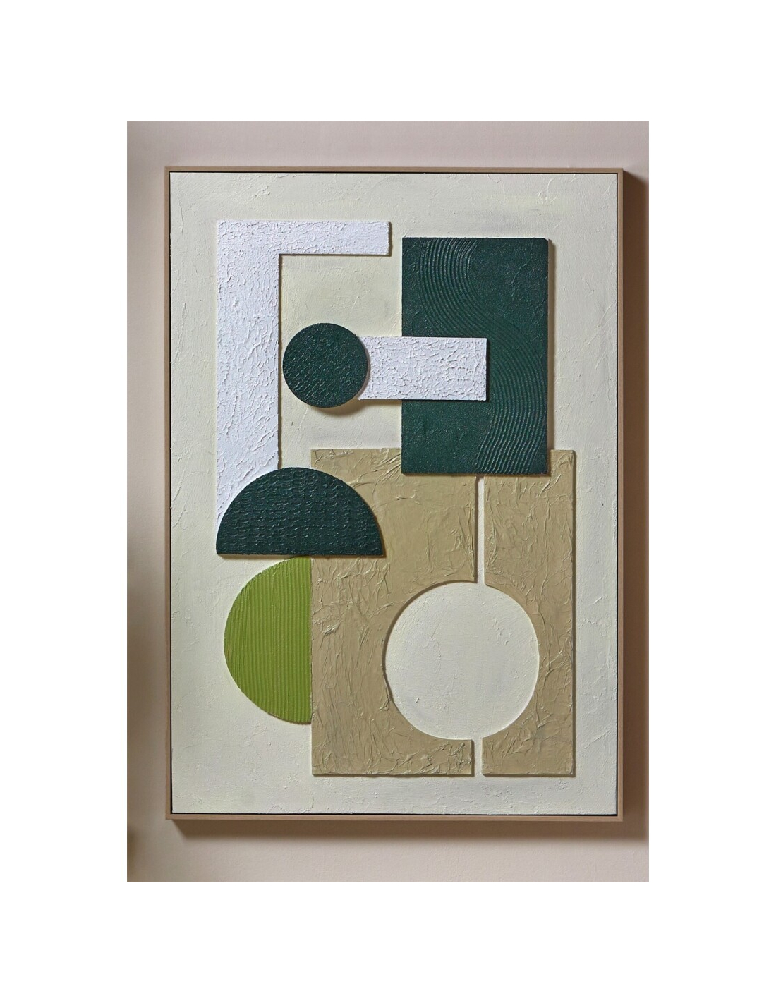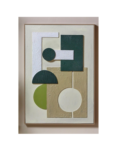 Cuadro abstracto relieves verdes blancos con marco, una pieza artística en la que las formas geométricas y texturas en relieve se combinan en tonos verdes y blancos para aportar frescura y dinamismo. Su acabado moderno y elegante convierte cualquier pared en un punto focal, ideal tanto para salones como para despachos contemporáneos. Con bastidor de pino y colgadores para posición vertical, es perfecto para quienes buscan un arte decorativo versátil y duradero que aporte estilo a su hogar.
