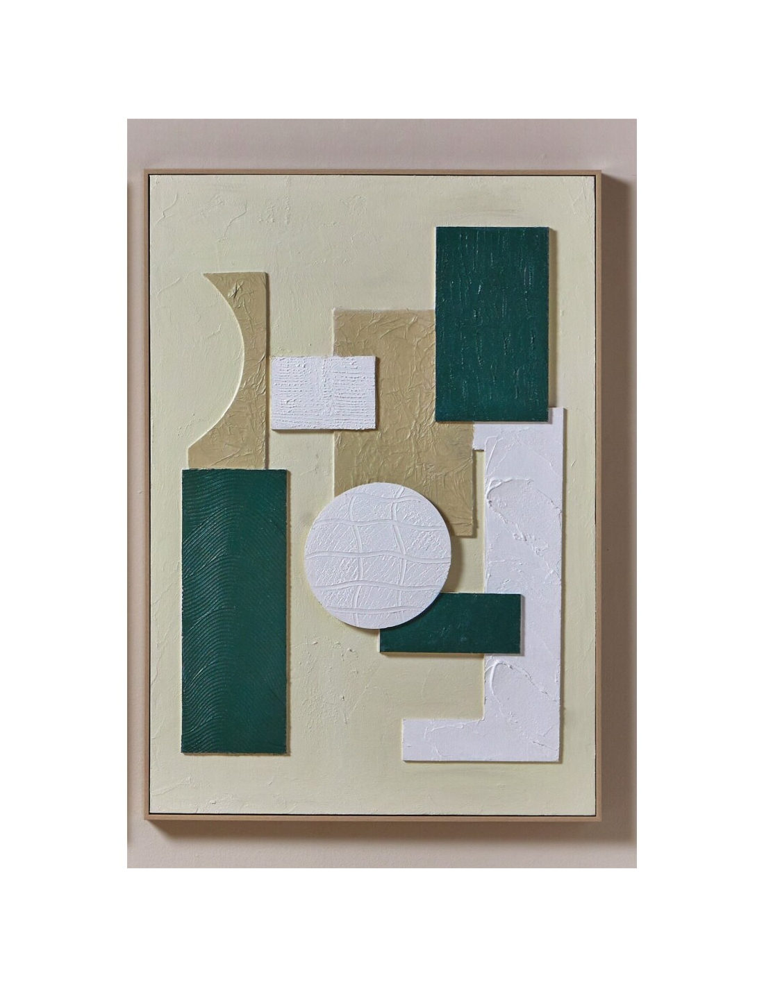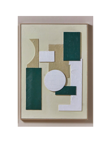Cuadro abstracto relieves blancos verdes con marco, diseñado con relieves en diferentes planos que generan un atractivo juego de luces y sombras. Los tonos blancos y verdes transmiten calma y naturalidad, integrándose con facilidad en distintos estilos de interiorismo. El marco aporta un acabado sofisticado y garantiza estabilidad, mientras que su orientación vertical lo hace ideal para pasillos, recibidores o como pareja de cuadros decorativos. Fabricado con bastidor de pino, combina estética y resistencia en una sola pieza.
