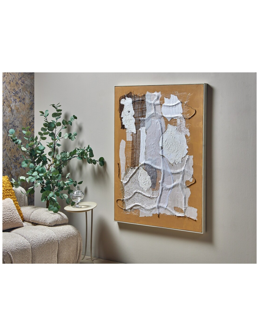 Cuadro abstracto telas con marco 92x122 cm, un cuadro que destaca por la superposición de diferentes telas en relieve, creando una composición única llena de movimiento y textura. Cada pieza de tela se integra en tonos neutros y cálidos, logrando un equilibrio perfecto entre originalidad y elegancia. Ideal para salones amplios o recibidores, este cuadro en bastidor de pino con marco PE es una apuesta por la decoración vanguardista que combina materiales y artesanía en una propuesta artística sofisticada.