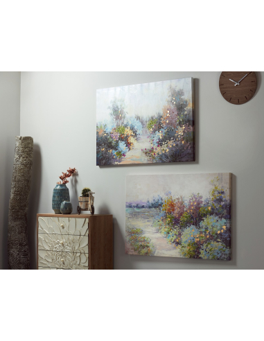 Set 2 lienzos impresos Sendero 50% óleo 120x80 cm, representan paisajes serenos trabajados con impresión y detalles al óleo en un 50%, lo que les da mayor realismo y profundidad. Los tonos suaves y naturales evocan tranquilidad, siendo perfectos para dormitorios, pasillos o zonas de relax. Montados sobre bastidor de pino, ofrecen calidad y resistencia, a la vez que aportan un aire acogedor y artístico a cualquier ambiente con un estilo clásico actualizado.