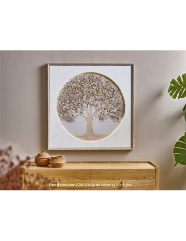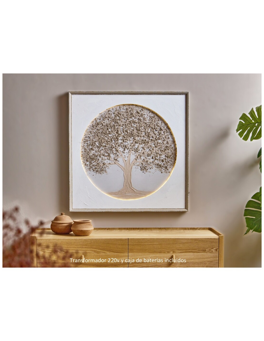 Óleo árbol vida con led con marco 80x80 cm, combina arte y tecnología, representando el árbol de la vida dentro de un círculo iluminado con luces LED. Esta pieza aporta calidez gracias a su iluminación ambiental, creando un efecto envolvente ideal para salones, dormitorios o entradas. Fabricado en DM con bastidor de pino, funciona con adaptador de corriente, siendo tanto un cuadro artístico como un punto de luz decorativa. Una opción perfecta para quienes buscan un toque simbólico, moderno y acogedor en su hogar.