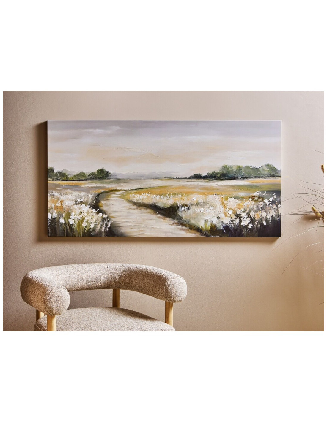 Lienzo impreso paisaje abstracto 50% óleo 140x70 cm, una pieza decorativa que transmite calma con sus tonalidades suaves y pinceladas de óleo que realzan los detalles del paisaje. Impreso sobre lienzo con bastidor de pino, combina la técnica impresa con acabados al óleo que le aportan textura y profundidad. Ideal para dormitorios o salones donde se busque un toque artístico y relajante, convirtiéndose en el centro de todas las miradas gracias a su formato alargado.