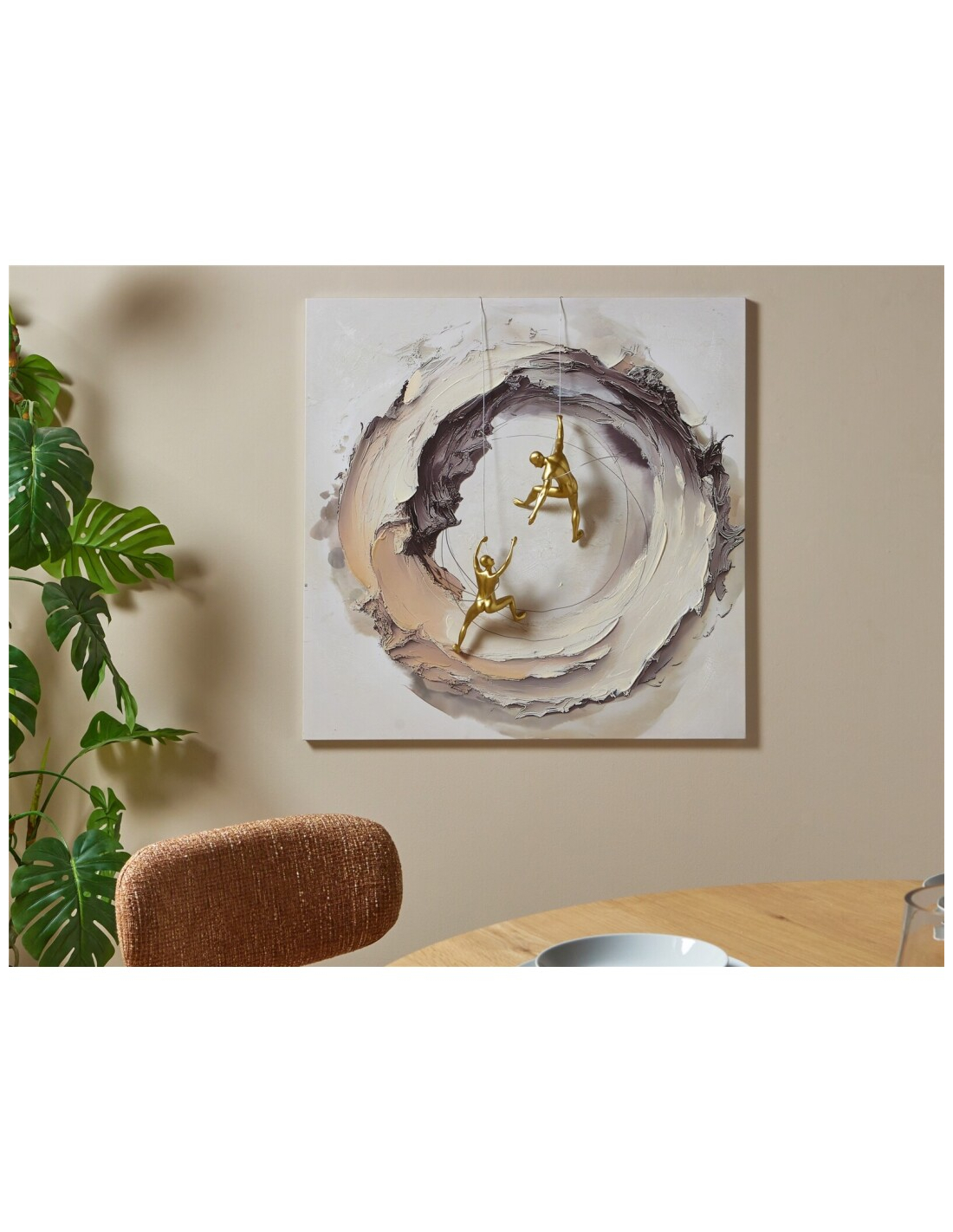 Lienzo abstracto escaladores en relieve 50% óleo, una obra innovadora que mezcla pintura en relieve y esculturas de resina en dorado, creando un efecto tridimensional impactante. Su diseño representa movimiento y dinamismo, ideal para quienes buscan una decoración moderna y diferente. Con bastidor de pino robusto y un grosor de 11 cm que refuerza su efecto escultórico, es perfecto para destacar en comedores o salones contemporáneos.