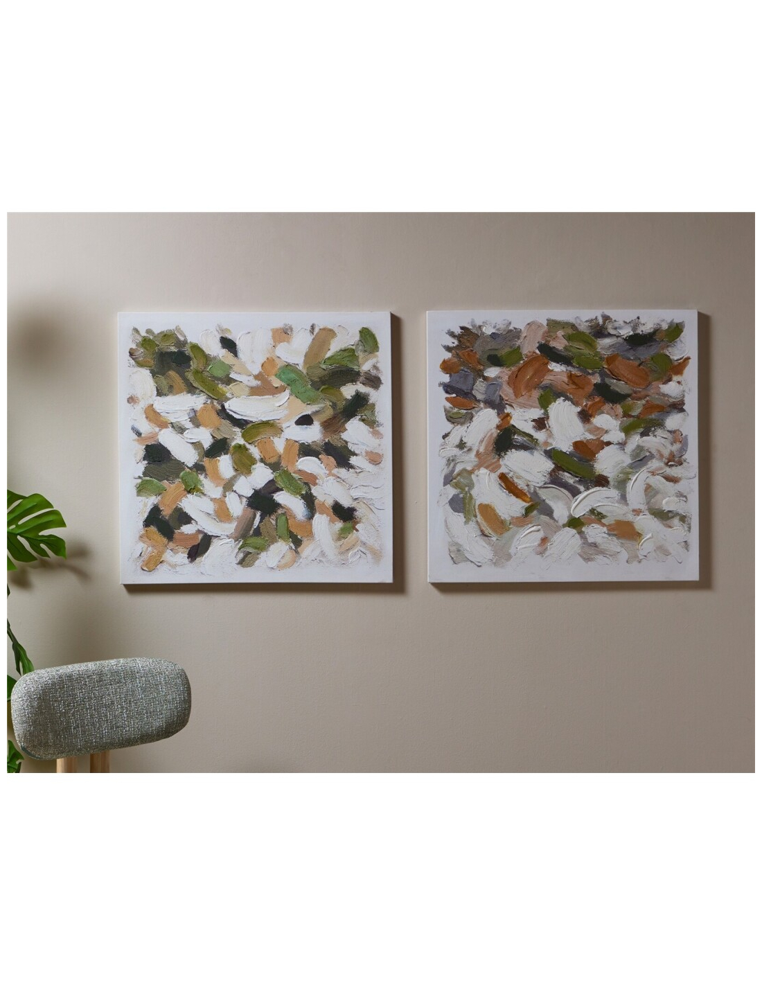 Set 2 lienzos impresos trazos verdes 70% óleo, un dúo de cuadros con pinceladas expresivas en tonos tierra y verdes que aportan equilibrio y sofisticación. El acabado al óleo les da relieve y un aspecto artesanal, destacando sobre su lienzo montado en bastidor de pino. Su formato cuadrado y versátil permite colgarlos juntos o por separado, adaptándose a paredes de distintas estancias para darles calidez natural.