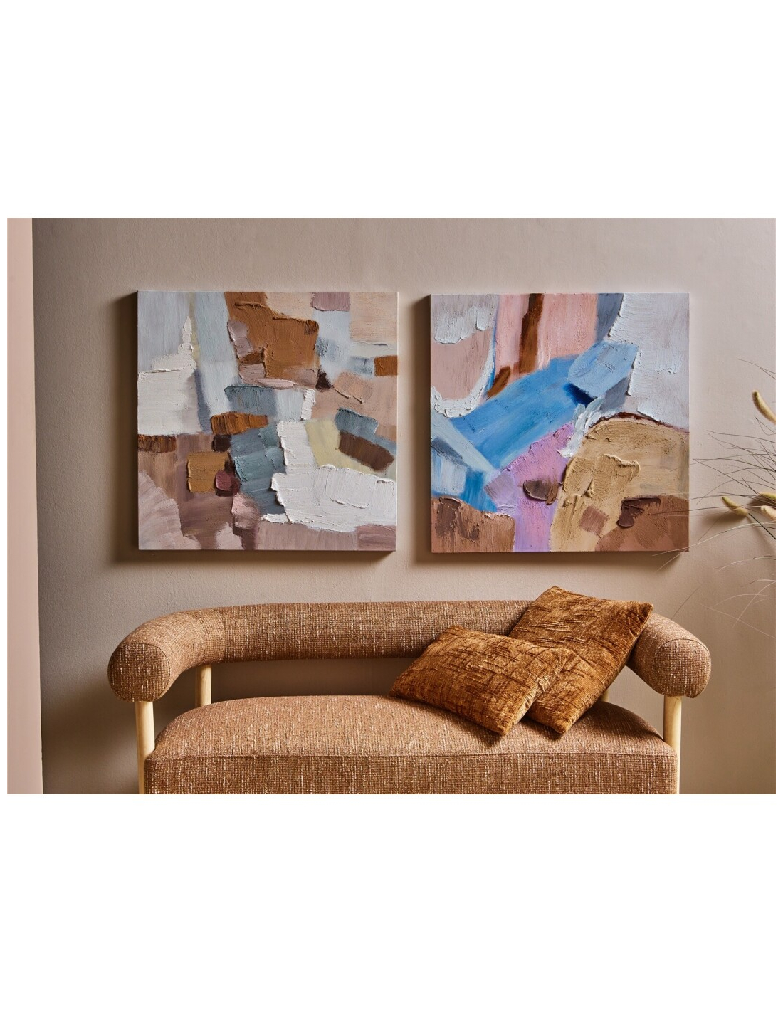 Set 2 lienzos impresos tonos pastel 70% al óleo, en colores suaves que transmiten serenidad y frescura, ideales para ambientes nórdicos o minimalistas. Sus trazos abstractos con acabado al óleo ofrecen textura y contraste, haciendo que cada pieza luzca como una obra única. Fabricados sobre bastidor de pino, garantizan durabilidad y calidad, aportando estilo tanto en dormitorios como en zonas de estar.
