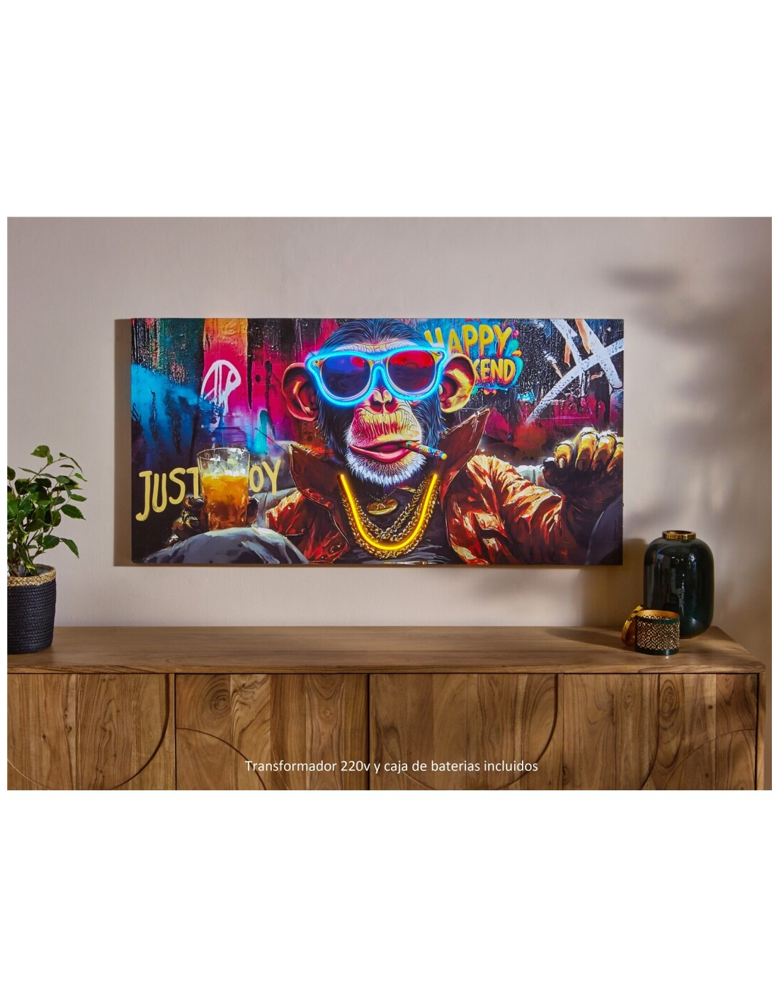 Lienzo impreso Pop Art mono 50% óleo con led, una pieza vibrante y divertida que combina el estilo urbano del pop art con la fuerza de los colores neón. La figura del mono con gafas de sol resalta gracias al efecto LED integrado, aportando dinamismo y un aire moderno a cualquier ambiente. Perfecto para quienes buscan un cuadro llamativo que se convierta en protagonista de la decoración, ideal en salones, bares o espacios juveniles. Funciona con adaptador de corriente o pilas, lo que lo hace práctico y versátil.