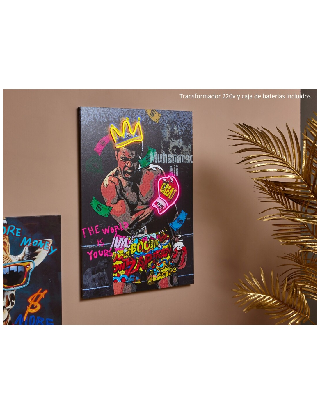 Lienzo impreso Pop Art boxeador 50% óleo con led, un cuadro impactante que rinde homenaje a los grandes íconos del boxeo en una fusión de arte y energía. El estilo gráfico y los detalles pintados al óleo se potencian con luces LED, que iluminan la composición y la convierten en una pieza cargada de carácter. Su diseño moderno con tipografías y colores intensos es ideal para espacios contemporáneos, aportando fuerza y personalidad en la decoración.