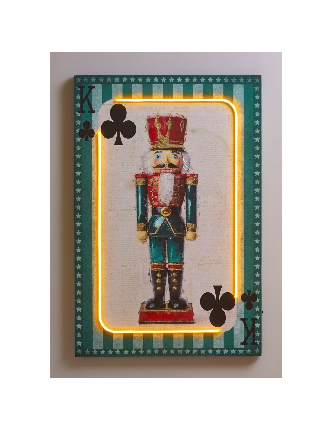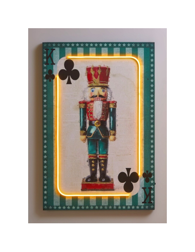 Lienzo impreso Rey verde 50% óleo con led, una versión elegante y original del clásico cascanueces. La pintura al óleo resalta las texturas y colores, mientras que el marco inspirado en una carta de juego aporta un toque creativo y distinto. El sistema LED integrado ilumina la pieza, generando un efecto cálido y atractivo. Ideal para destacar en salones, recibidores o incluso como decoración temática en fiestas.