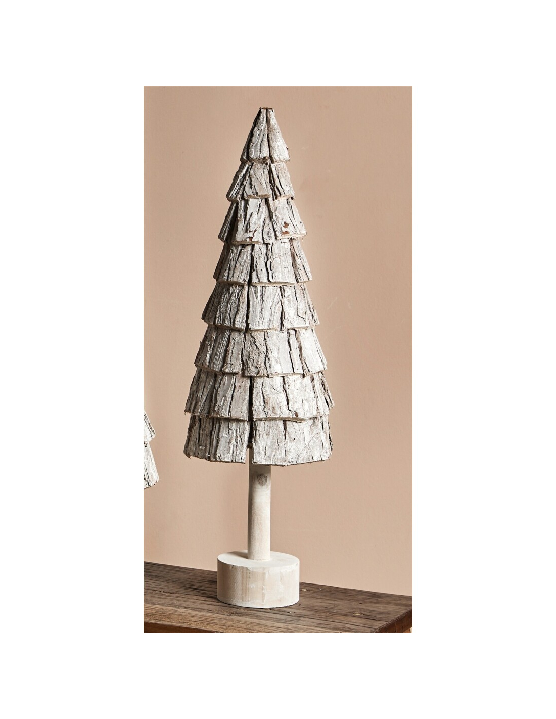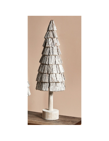 Abeto Navidad Lascas corteza decapado 63 cm, con acabado en corteza decapada que aporta un look nórdico y elegante. Su pie de madera le da estabilidad y un aspecto artesanal que encaja con diferentes estilos decorativos. El tono blanco envejecido resalta su diseño, aportando luminosidad y frescura a la decoración navideña. Una pieza decorativa que aporta calidez y sofisticación en cualquier espacio.