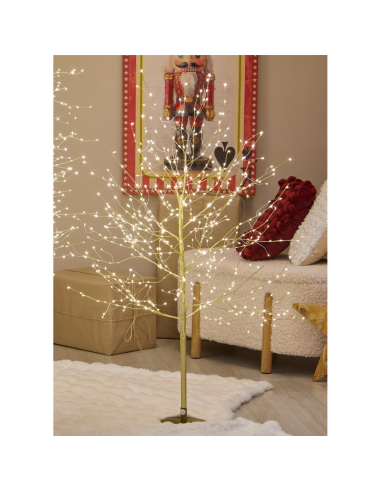 Árbol Navidad micro led oro 120 cm, una propuesta elegante y sofisticada que aporta brillo gracias a sus 660 micro LED cálidos. Su acabado en tono dorado lo convierte en un elemento llamativo y moderno que realza cualquier espacio. Funciona con transformador de 31V y 3,6W, garantizando eficiencia y seguridad con clasificación IP44. La base metálica de 16 cm de diámetro asegura estabilidad incluso en superficies reducidas. Incluye un cable de 5 m que brinda flexibilidad para ubicarlo en diferentes lugares. Su diseño de ramas finas iluminadas crea un efecto cálido y envolvente. Es ideal para salones, entradas o escaparates comerciales. Un árbol que combina estilo, practicidad y distinción en cada detalle.