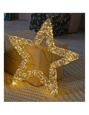 Estrella 3D oro pet 55 cm 1200 leds, un diseño de mayor tamaño que destaca por su imponente estructura tridimensional en forma de estrella y su cálido resplandor proporcionado por 1200 luces LED. Su acabado dorado y entramado metálico con PVC le otorgan un estilo moderno y elegante, perfecto para realzar tanto espacios residenciales como comerciales. Con sus dimensiones de 55 cm, se convierte en un elemento decorativo central que aporta protagonismo y luminosidad a cualquier ambiente. Su cable de 5 metros facilita la instalación en distintos lugares, ya sea en el suelo, sobre muebles o colgada en espacios amplios. Ofrece una luz cálida y constante que crea un entorno acogedor y festivo. Su diseño tridimensional permite que brille con fuerza desde cualquier ángulo, convirtiéndose en una pieza clave de la decoración. Ideal para quienes buscan una propuesta sofisticada y luminosa de gran impacto visual.