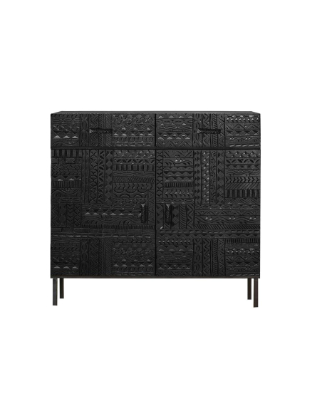 Práctica y amplia cómoda Jeroglífico con 2 puertas y 2 cajones en madera de mango y hierro para guardar todo lo que necesites en cualquier estancia de tu hogar.