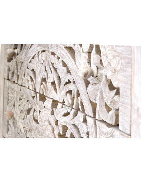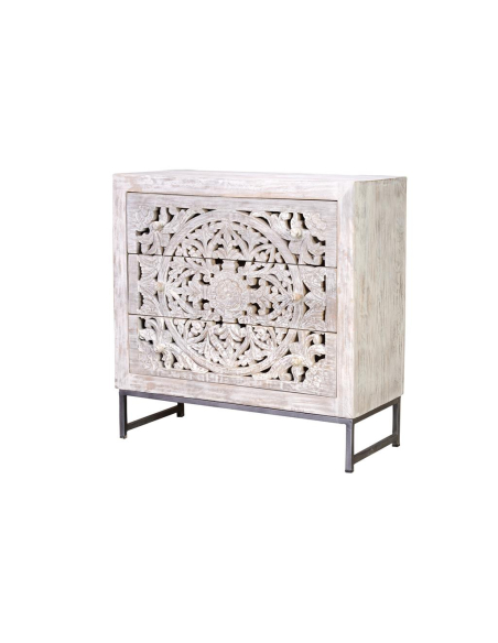 Práctica y amplia cómoda con 3 cajones en madera de mango blanco envejecido y base en hierro gris para guardar todo lo que necesites en cualquier estancia de tu hogar.