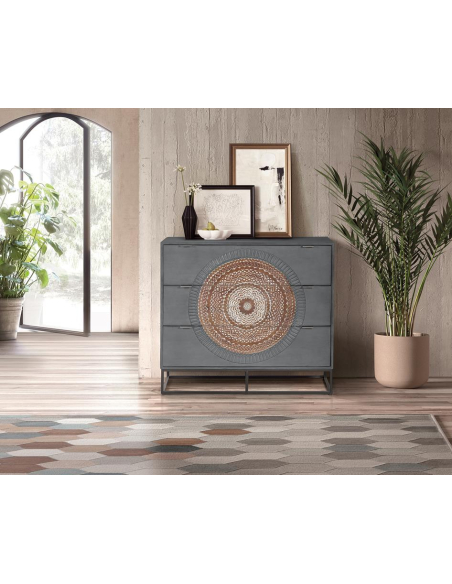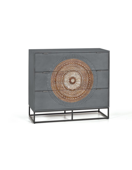 Cómoda 3 cajones en madera de mango y base de metal