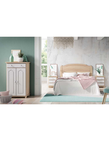 Composición de dormitorio Provenzal, todo lo que necesitas para amueblar tu zona favorita de descanso. Conjunto de cabecero, mesitas de noche y zapatero. Todo lo necesario para una habitación funcional.