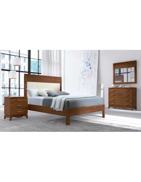 - Cabecero Vega tapizado de 150 cm + 2 mesitas de noche + cómoda + espejo.