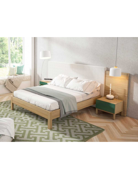 Composición de dormitorio modelo Zoe, todo lo que necesitas para amueblar tu zona favorita de descanso de manera moderna a la vez que sencilla. Conjunto para habitación compuesto de cabecero Riga tapizado de 223 cm con un panel lateral, mesita Zoe 1 cajón, mesita Zoe dos cajones y bañera Vega con patas.