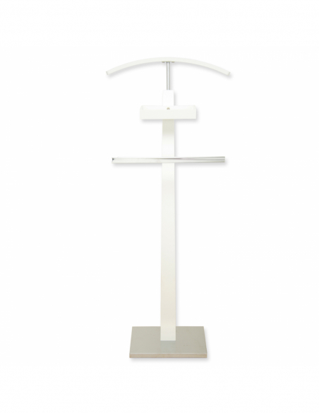 Galán madera y metal blanco perfecto para decorar tu dormitorio y evitar que se arrugue la ropa.