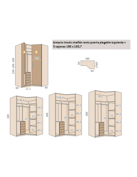 Armario rincón chaflán recto puerta con 5 cajones vistos, de 100,7 cm por el lado fijo y disponible a izquierda y derecha con la puerta plegable de 180 cm. Posibilidad de tres alturas de 220, 240 o 260 cm dependiendo de la altura disponible. Cajones con autofreno.