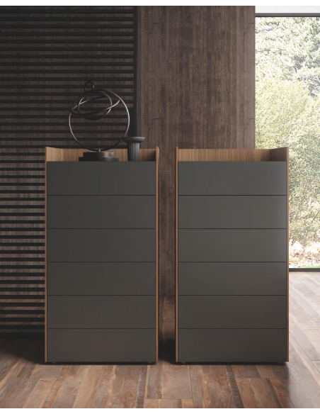 •  Acabados en Nogal Americano con detalles y frentes en Grafito.