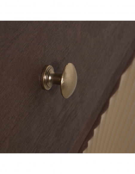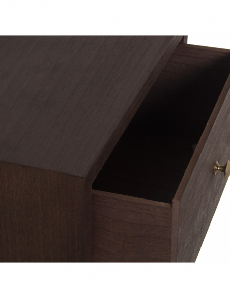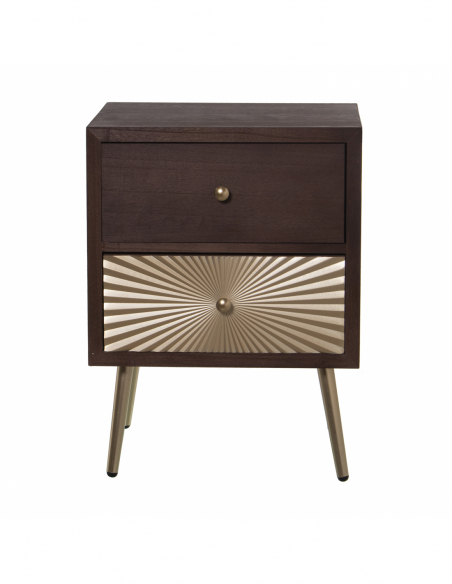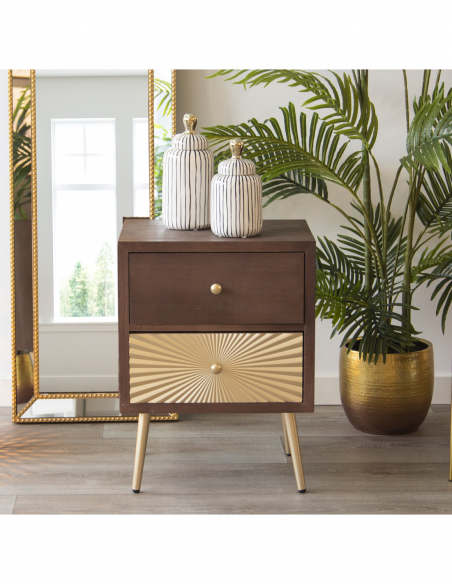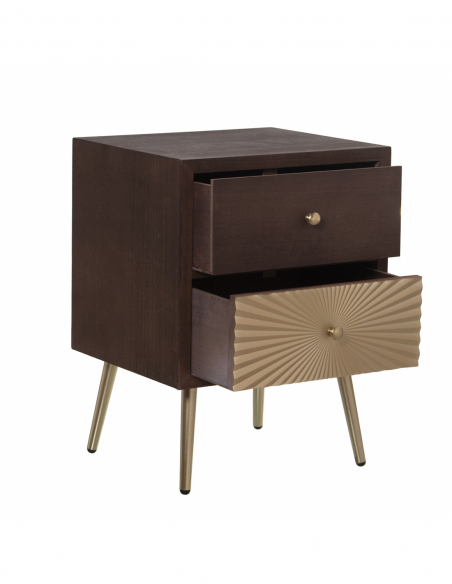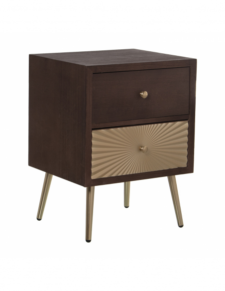 Mesa de noche 2 cajones madera nogal dorado ideal para combinar en tu dormitorio. Esta pieza te aportará calidez y armonía en la estancia de descaso de tu hogar.