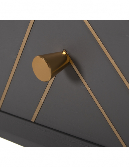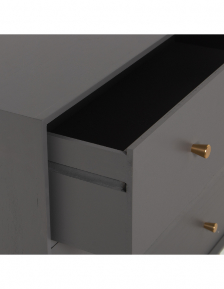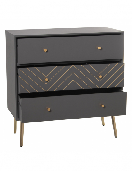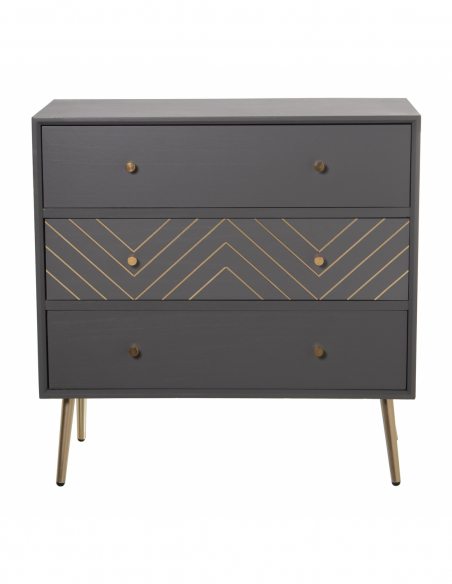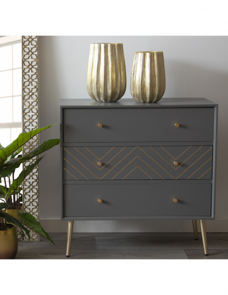 Cómoda 3 cajones madera gris dorado para que decores tu dormitorio de la mejor de las maneras. Un toque de color a la vez de ese espacio de almacenaje tan necesario.