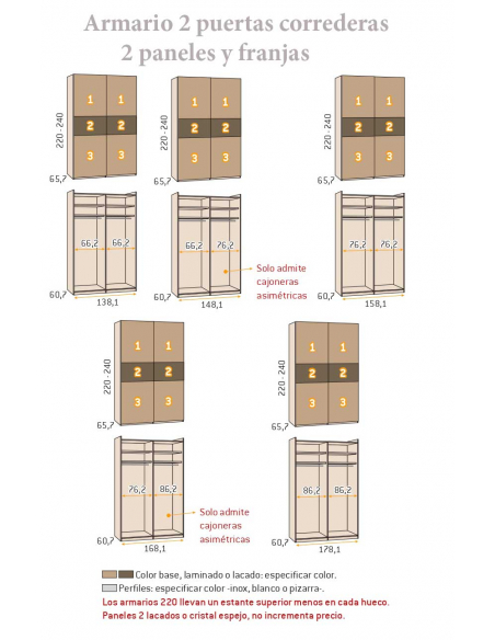 Armario dos puertas correderas con dos paneles y franjas, disponible en once anchuras diferentes a partir de 138,10 cm, y dos alturas de 220 y 240 cm. Echa un vistazo a los acabados para las puertas.