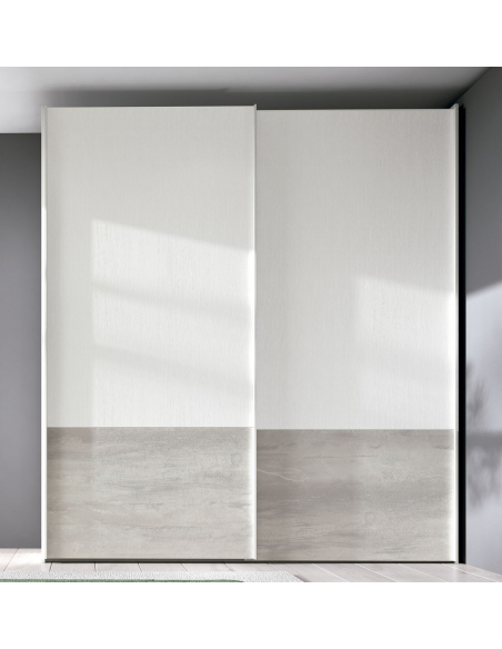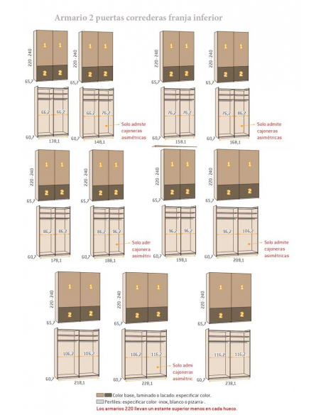 Armario Puertas Correderas con Franja Inferior, disponible en once anchuras diferentes a partir de 138,10 cm, y dos alturas de 220 y 240 cm. Echa un vistazo a los acabados para las puertas.