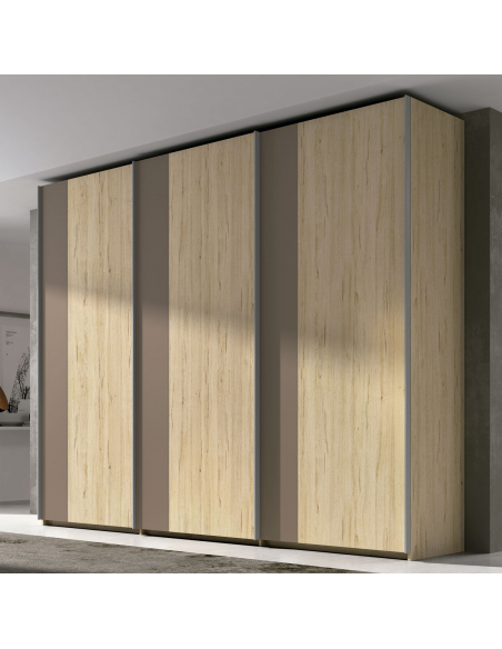 Armario tres puertas correderas colgadas con Franja Vertical, disponible en diez anchuras diferentes a partir de 206,20 cm, y dos alturas de 220 y 240 cm. Echa un vistazo a los acabados para las puertas.