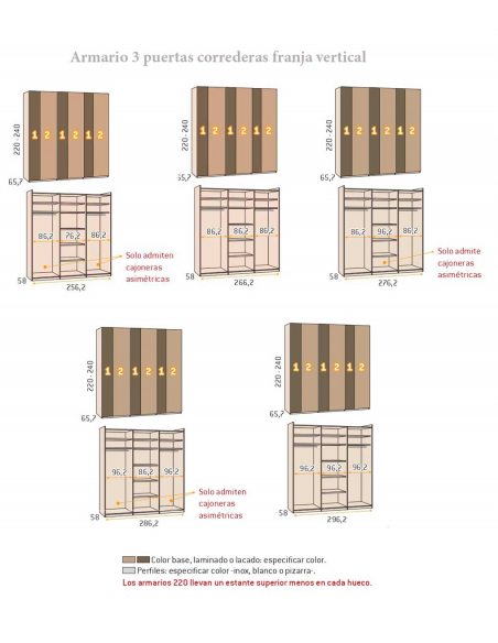 Otros datos: en armarios con huecos desiguales hay que utilizar para los huecos grandes cajoneras y bandejas extraíbles asimétricas. Estos armarios son de serie izquierdos (tiene el costado izquierdo con más fondo que el derecho y la puerta izquierda es la puerta exterior), si se quiere derecho lo tienen que indicar en comentarios.