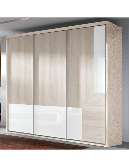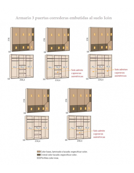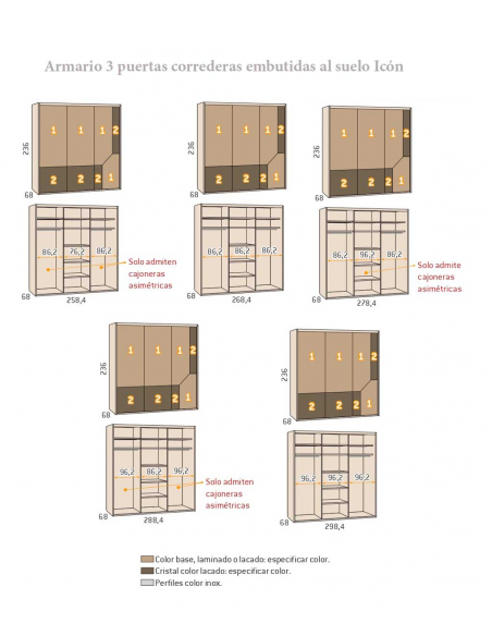 Armario tres puertas correderas embutidas al suelo Icon, disponible en diez anchuras diferentes a partir de 208,40 cm, y de 236 cm de alto con posibilidad de pedirlo a medida de altura de 219 a 260 cm. Echa un vistazo a los acabados para las puertas.