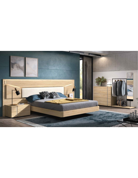 Composición de dormitorio matrimonio modelo Elba 05 para cama de 150x190 cm, todo lo que necesitas para amueblar tu zona favorita de descanso de manera moderna a la vez que sencilla. Conjunto para habitación compuesto de cabecero Elba tapizado de 305 cm, bancada volada curva base, mesitas NoaVertical 2 cajones, cómoda Noa-Vertical y espejo auxiliar con colgador.