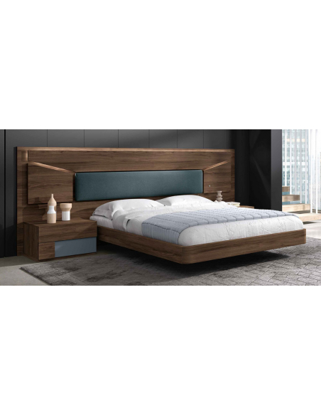 Composición de dormitorio matrimonio modelo Elba 07 para cama de 150x190 cm, todo lo que necesitas para amueblar tu zona favorita de descanso de manera moderna a la vez que sencilla. Conjunto para habitación compuesto de cabecero Elba tapizado de 305 cm, bancada volada curva base, mesitas Kúbica Tetris 2 con un frente lacado.