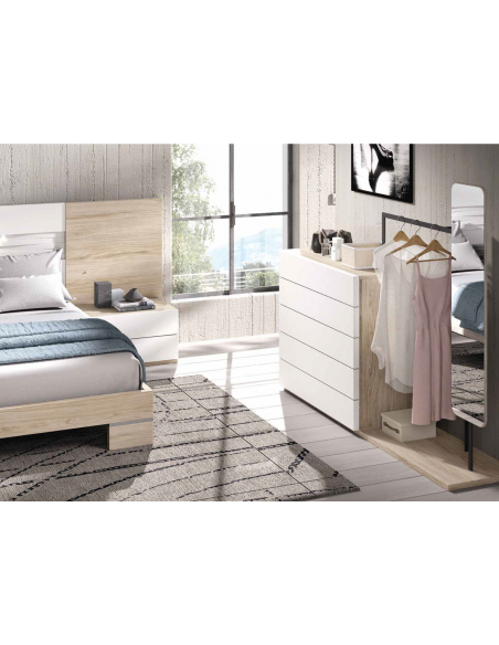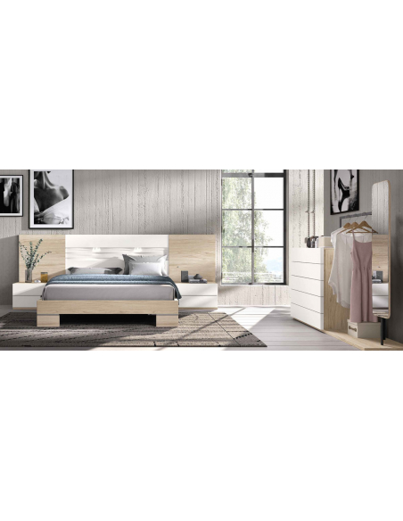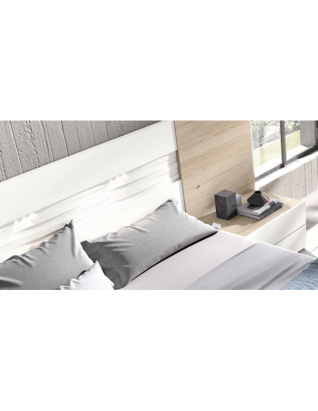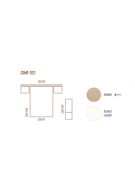 - Acabados base en Habana, parte central del cabecero lacado en Blanco, frentes mesitas y cómoda lacados en Blanco.