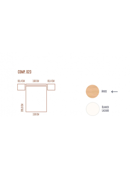 - Acabados base en Habana, parte central del cabecero lacado en Blanco, frente cajón central mesitas y parte inferior bancada lacados en Blanco.