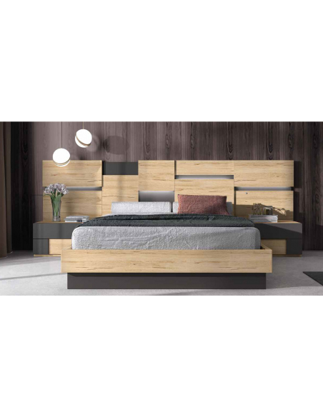 Composición de dormitorio matrimonio modelo Stratos 033 para cama de 150x190 cm, todo lo que necesitas para amueblar tu zona favorita de descanso de manera moderna a la vez que sencilla. Conjunto para habitación compuesto de cabecero Stratos de 304 cm, bancada bicolor y mesitas de noche Kúbica-Tetris de 2 cajones.