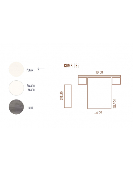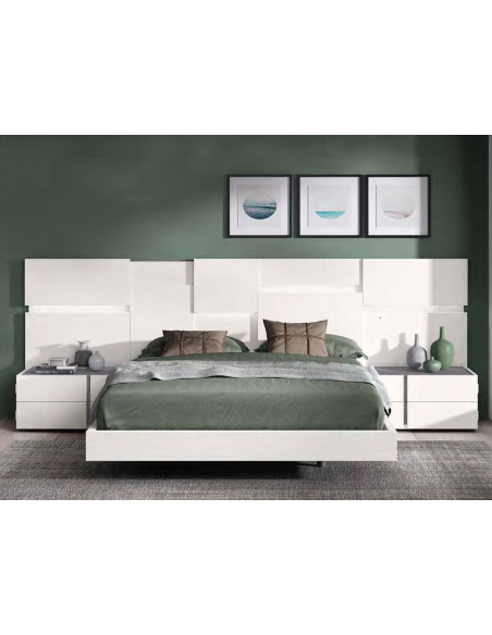 Composición de dormitorio matrimonio modelo Stratos 035 para cama de 150x190 cm, todo lo que necesitas para amueblar tu zona favorita de descanso de manera moderna a la vez que sencilla. Conjunto para habitación compuesto de cabecero Stratos de 304 cm, bancada volada recta y mesitas de noche Noa-Vertical de 2 cajones.