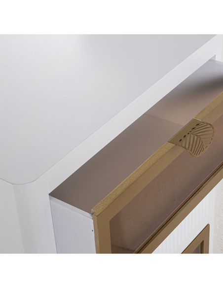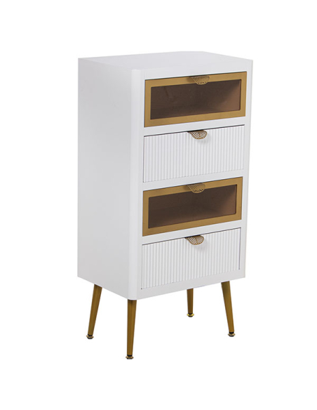 Sinfonier madera con 4 cajones blanco y dorado . Este sinfonier de madera blanca y dorada cuenta con cuatro cajones, dos de ellos con detalles en cristal. Con una dimensión de 45X30X88 CM y una altura de patas de 20,5 CM, es una adición elegante y funcional a cualquier habitación.