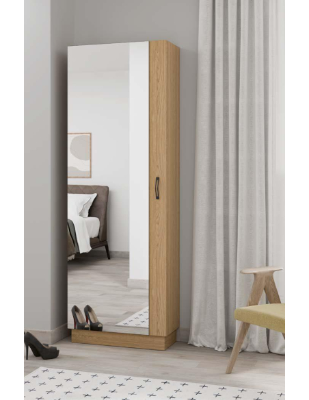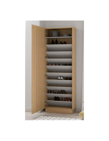 Mueble Zapatero alto y ancho modelo Natura. Mueble zapatero con puerta y estantes en el interior para facilitar el almacenaje de los zapatos. Fabricado con tableros melamínicos de primera calidad, resistentes al impacto, fácil de limpiar y con propiedades antibacterianas y antivíricas.