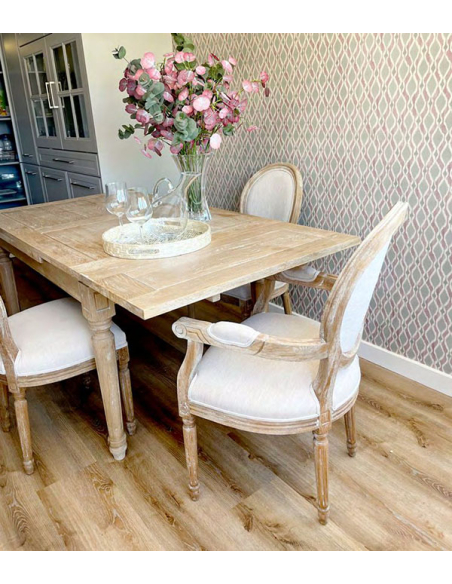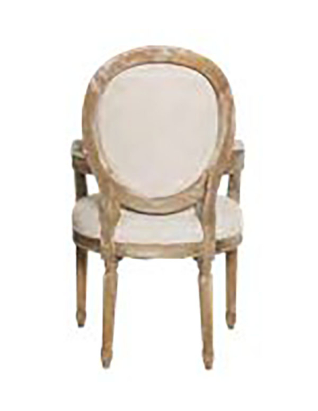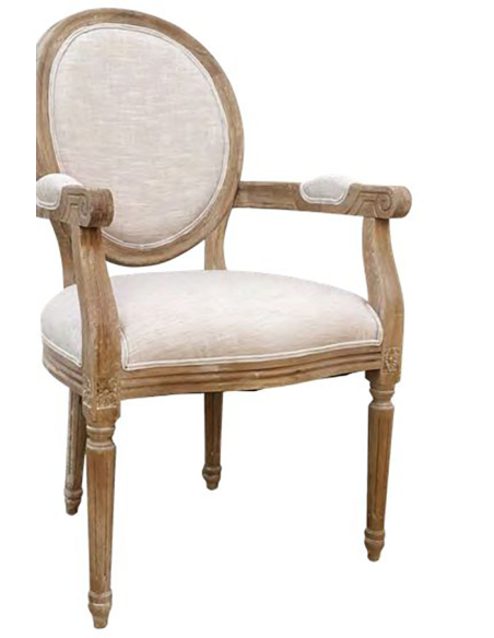 Conoce el Sillón Martina en madera de roble color natural con toque desgastado, tapizado en tela color beige, respaldo redondo enmarcado en la misma madera, de estilo clásico. Un complemento ideal para la habitación o cualquier rincón de la casa al que queramos darle un toque de elegancia.