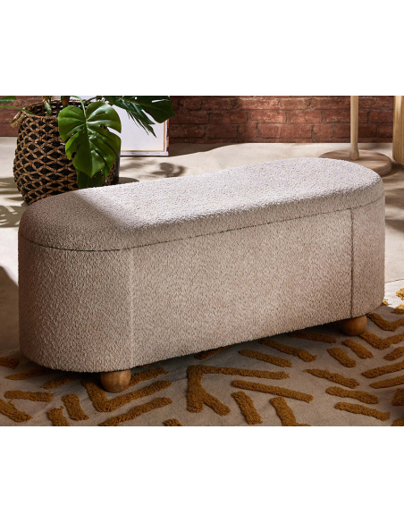 Descalzadora rizo suave beige, combina estilo y funcionalidad con su asiento acolchonado tapizado en un textil suave, ideal para ofrecer comodidad al quitarse los zapatos. Su forma ovalada y los laterales redondeados aportan un toque elegante y contemporáneo, mientras que las patas de madera redondas y bajas garantizan estabilidad y un diseño ligero. La tapa superior revela un práctico espacio de guardado interno, perfecto para mantener ordenados zapatos, mantas u otros accesorios. Ideal para entradas, vestidores o dormitorios, esta descalzadora se convierte en una pieza versátil y decorativa en cualquier hogar.