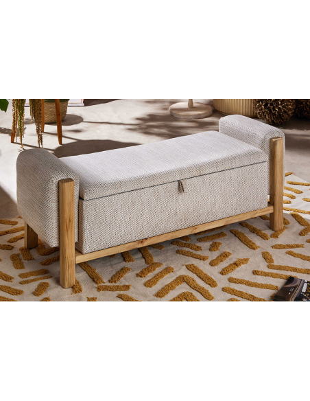 Banco natural con almacenaje y apoyabrazos 114 cm, combina funcionalidad y estilo, convirtiéndose en una adición versátil para cualquier espacio de tu hogar. Equipado con apoya brazos en los laterales, proporciona comodidad y soporte, mientras que su base de madera a la vista añade un toque de calidez y elegancia. La superficie acolchonada, tapizada en un textil suave, garantiza un asiento cómodo, mientras que la tapa retráctil revela un ingenioso espacio de almacenamiento, ideal para guardar mantas, zapatos o cualquier objeto que desees tener a mano. Perfecto para entradas, salas de estar o dormitorios, este banco es una solución práctica que realza la decoración de tu hogar.