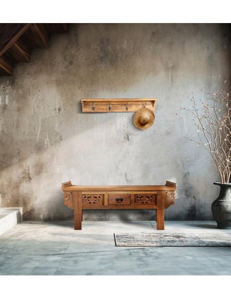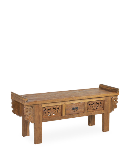 Pie de cama teka talla 1 cajón, una pieza sumamente duradera que combina funcionalidad y estilo. Con un pequeño cajón en el frente, ofrece espacio de almacenamiento adicional, ideal para mantener tu dormitorio organizado. Los detalles calados en madera, tanto en el frente como en los laterales, añaden un toque artesanal y elegante, mientras que las patas elevadas aportan ligereza visual y facilidad para la limpieza. Su diseño inspirado en el estilo balinés le da un aire exótico y sofisticado, haciendo de este pie de cama una pieza destacada en cualquier dormitorio.