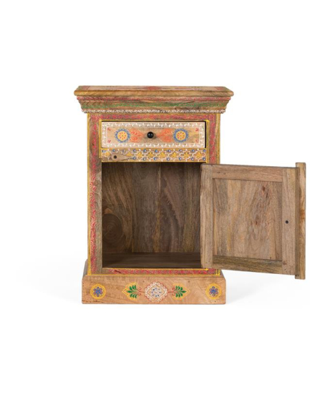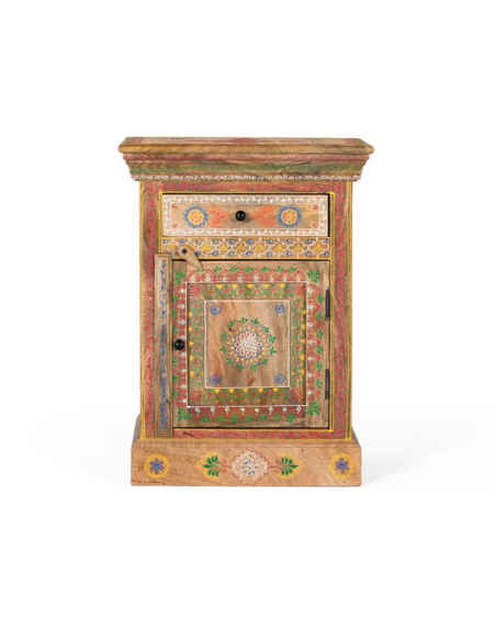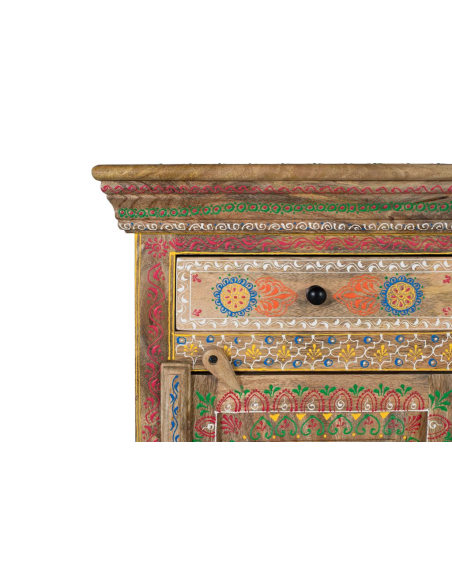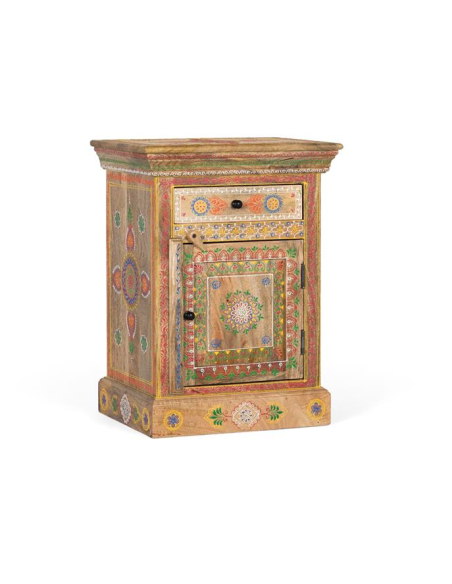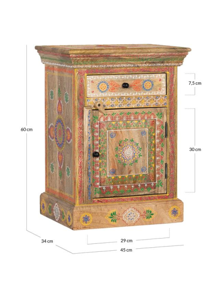 Mesita de noche Kalena, elaborada en madera de mango con hermosos detalles orientales pintados a mano. Esta pieza única combina funcionalidad y estética, ofreciendo un cajón superior y una puerta inferior con espacio de almacenamiento adicional. Toda la superficie de la mesilla está decorada con motivos orientales que aportan un toque de elegancia y cultura a cualquier habitación. Los tiradores redondos en color negro completan su diseño, mientras que su base robusta sin patas le otorga estabilidad y un estilo más sólido y clásico. Ideal para quienes buscan una pieza práctica con un toque distintivo para su dormitorio.