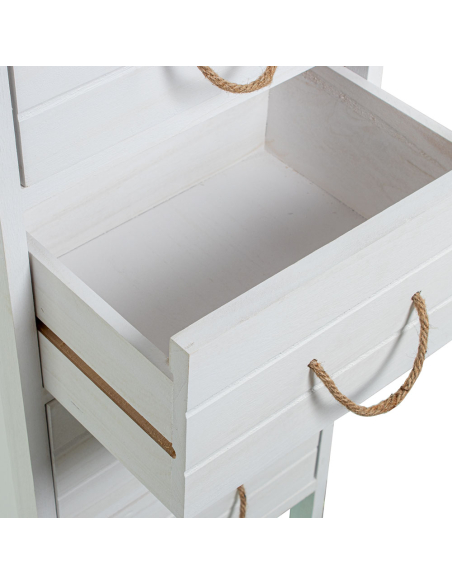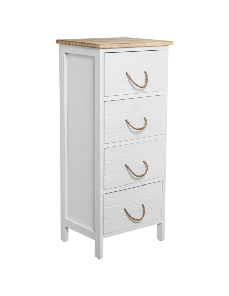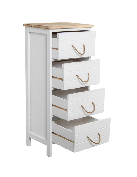Sinfonier Leonor 5 cajones madera, es la solución perfecta para quienes necesitan espacio adicional de almacenamiento sin comprometer el diseño. Su estructura vertical y estilizada se adapta fácilmente a espacios reducidos, aprovechando al máximo cada rincón de la habitación. Este mueble cuenta con cinco cajones amplios, ideales para guardar ropa, accesorios, documentos u otros objetos, manteniendo siempre el orden en tu hogar. Su acabado blanco le confiere una apariencia limpia y moderna, mientras que la parte superior en madera natural añade calidez y un toque rústico. Los tiradores de cuerda natural no solo son funcionales, sino que también realzan su diseño único, aportando un detalle artesanal que lo diferencia de otros muebles. Este sifonier es una opción ideal tanto para dormitorios como para cualquier espacio donde se requiera almacenamiento adicional con estilo. Su diseño atemporal y su funcionalidad lo convierten en un mueble imprescindible para quienes buscan practicidad sin sacrificar la estética.