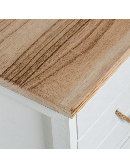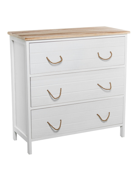 Cómoda Leonor 3 cajones madera blanca, es perfecta para quienes buscan un diseño funcional y elegante que se adapte a cualquier ambiente. Cuenta con tres amplios cajones que proporcionan espacio suficiente para almacenar ropa, textiles u objetos personales, manteniendo tu hogar ordenado y organizado. El diseño combina líneas limpias y modernas con detalles rústicos como los tiradores de cuerda, que aportan un toque natural y auténtico. Su color blanco realza la luminosidad de los espacios, haciéndola ideal para dormitorios, salas de estar o recibidores. Además, su tamaño compacto la convierte en una opción versátil para espacios reducidos sin sacrificar capacidad de almacenamiento.