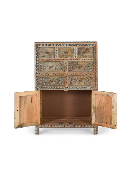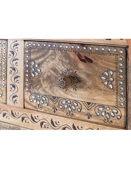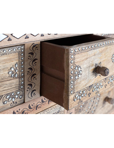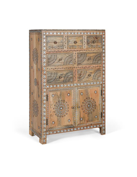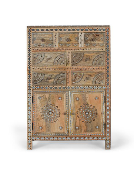 Cómoda Oriental pintada a mano, fabricada en madera maciza de mango en tono natural, destaca por la profusa y detallada decoración pintada a mano o con incrustaciones que cubre sus frentes y laterales, incluyendo elaborados mándalas y cenefas con posibles detalles de espejo o nácar. Esta cómoda ofrece una impresionante capacidad de almacenamiento distribuida verticalmente. Cuenta con múltiples cajones de diferentes tamaños en la parte superior y un armario de dos puertas en la inferior, permitiendo organizar una gran variedad de prendas y objetos. Cada detalle decorativo es testimonio de una rica tradición artesanal. Perfecta como pieza central en un dormitorio, vestidor o incluso en un salón de estilo bohemio, étnico, ecléctico o global. Esta cómoda no es solo un mueble funcional, sino una verdadera obra de arte que aporta carácter, exotismo y una belleza única a tu decoración.