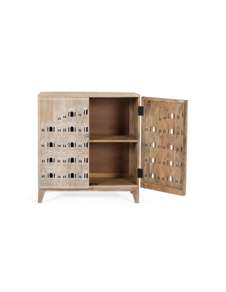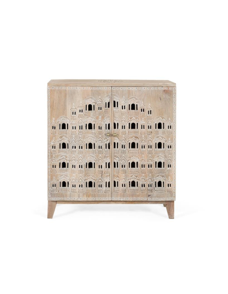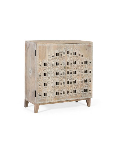 Mueble auxiliar Adagio 2 puertas bajo, aporta carácter artesanal y calidez natural a tu hogar. Fabricado en madera maciza de mango con acabado natural decapado, luce un frente tallado a mano inspirado en celosías orientales que convierte cada pieza en única. Su formato bajo encaja perfecto como aparador compacto en salón, recibidor o dormitorio, ofreciendo almacenaje funcional gracias a una balda interior fija que crea dos niveles para vajilla, libros o textiles. Los tiradores metálicos y las patas cónicas elevadas aportan ligereza visual y facilitan la limpieza. Mantenimiento sencillo (paño suave, sin abrasivos). No requiere montaje: llega lista para colocar y disfrutar. Ideal para estilos boho, mediterráneo, rústico-chic o ecléctico, combina de maravilla con fibras naturales, tonos tierra y metales envejecidos.