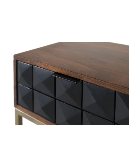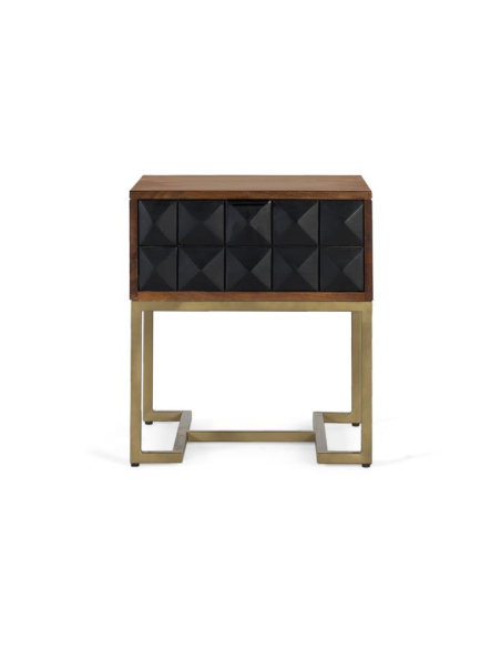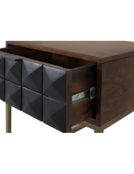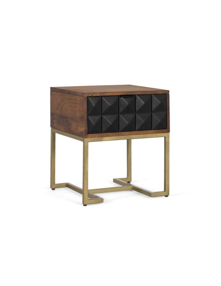 Mesita de noche Grave negro 1 cajón, eleva el estilo de tu dormitorio con esta mesita de noche de líneas contemporáneas. Fabricada en madera de mango con un cálido tono avellana, luce un frente de cajón geométrico en relieve acabado en negro mate que aporta profundidad y carácter. La estructura descansa sobre una base metálica de perfil abierto con acabado latón satinado, ligera a la vista y muy estable. El cajón único ofrece espacio para tener a mano libros, gafas o dispositivos, mientras que el tirador oculto mantiene la estética limpia. Una pieza versátil que encaja en interiores modernos, nórdicos o industrial chic, ya sea como mesilla, auxiliar en el salón o apoyo en un rincón de lectura.