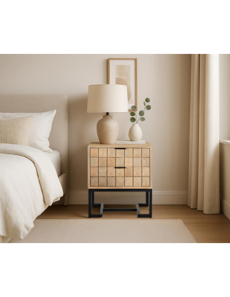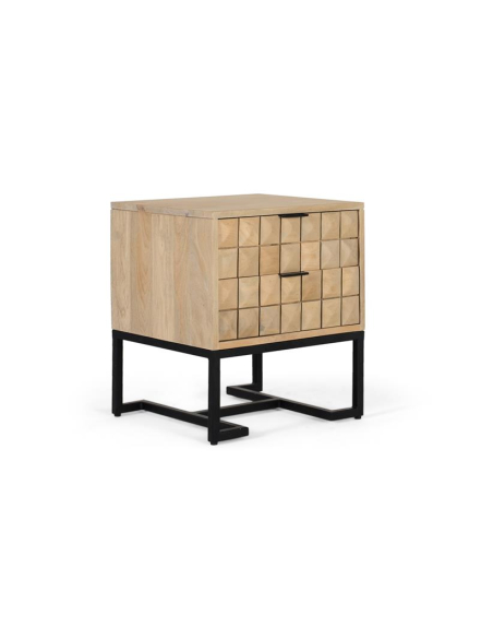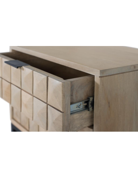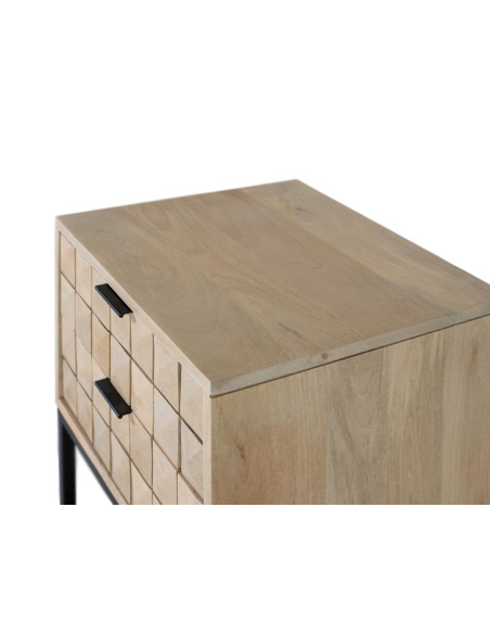 Mesita de noche Grave natural 2 cajones, eleva la estética del dormitorio con esta mesita de noche de madera maciza de mango en acabado natural, combinada con una base de metal negro de líneas rectas que aporta un aire contemporáneo-industrial. El frente de sus dos cajones luce un relieve geométrico en 3D que añade textura y personalidad sin recargar el espacio. Perfecta como mesilla junto a la cama o como auxiliar en un rincón de lectura, ofrece almacenamiento práctico para libros, gafas y accesorios, manteniendo todo a mano y ordenado. La estructura sólida garantiza estabilidad y durabilidad, mientras que los tiradores negros minimalistas facilitan una apertura cómoda. Fácil de integrar con cabeceros de madera, textiles claros o lámparas metálicas, es una pieza versátil que suma calidez natural y diseño actual a cualquier dormitorio.